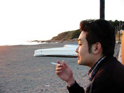 夕日に一服。なんだかウソ臭い。